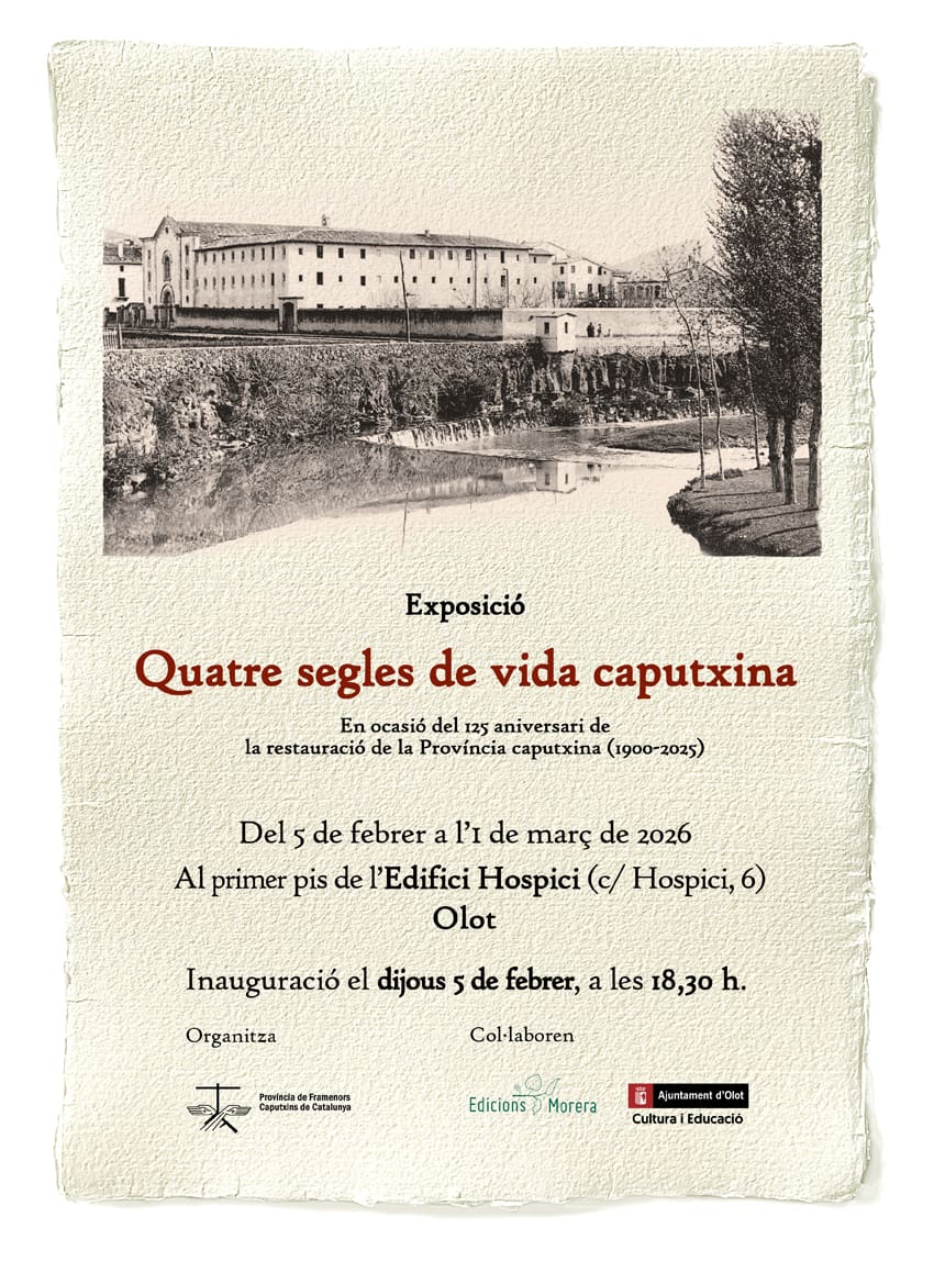 L’exposició Quatre segles de vida caputxina farà parada a Olot el proper 5 de febrer, on s’instal·larà a l’històric Edifici de l’Hospici. La mostra, inaugurada el maig de 2025 al santuari de Pompeia de Barcelona i posteriorment exhibida al Museu Comarcal de l’Anoia, retrata la trajectòria dels framenors caputxins a Catalunya entre 1578 i 1968. Impulsada amb motiu del 125è aniversari de la restauració de la Província caputxina, l’exposició es presenta a través de 34 plafons amb imatges i textos breus que sintetitzen el llibre de l’historiador fra Valentí Serra de Manresa, comissari de la proposta. Durant el 2026, la itinerància continuarà per les Borges Blanques, Arenys de Mar i Palma de Mallorca. L’organització és a càrrec de la Província de Framenors Caputxins de Catalunya i la producció d’Edicions Morera, amb el suport de l’Ajuntament d’Olot.